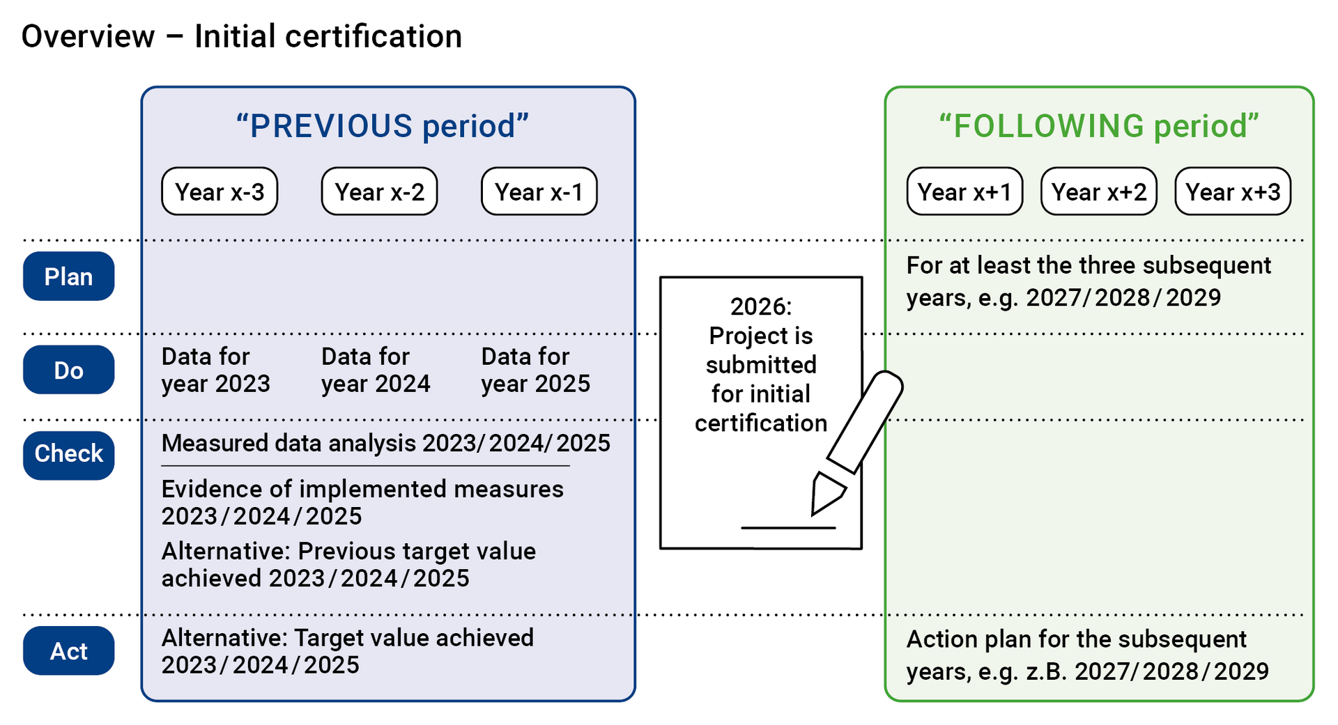 - Check: A data analysis is performed based on the data submitted as part of the “Do” step. A check is carried out to see whether planned measures have already been implemented during the previous one to three years. A check is also performed to determine whether the target value was achieved in the previous period.