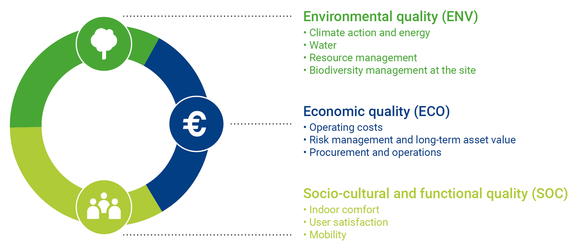 The DGNB System for Buildings In Use focuses on all relevant aspects of sustainable building operation and long-term value retention in just ten criteria from three topic areas. The basic structure of the DGNB System for Buildings In Use is based on the well-known three-pillar model of sustainability and divides the essential aspects of sustainable building operation into the topic areas of environmental quality, economic quality as well as socio-cultural and functional quality.