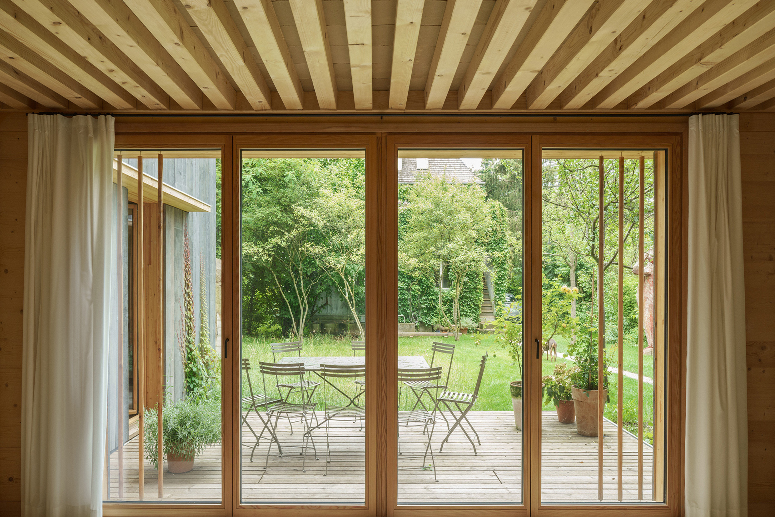 Mit dem Projekt „Unser Gartenhaus – Haus ohne Zement“ in München haben Florian Nagler Architekten die Wohn- und Bürofläche des bestehenden Vorderhauses im Sinne der Nachverdichtung erweitert. Auf drei Geschossen wurde eine ressourcenschonende, energieeffiziente Bauweise mit ästhetischer Gestaltung und praktischer Funktionalität kombiniert. Der Architekt setzt damit seinen Forschungsansatz des einfachen Bauens fort. Neben der nachhaltigen Holzbauweise in handwerklich hochwertiger Qualität, einer flächeneffizienten Raumaufteilung und einer minimalen Gründung wurde dabei konsequent auf Zement verzichtet.