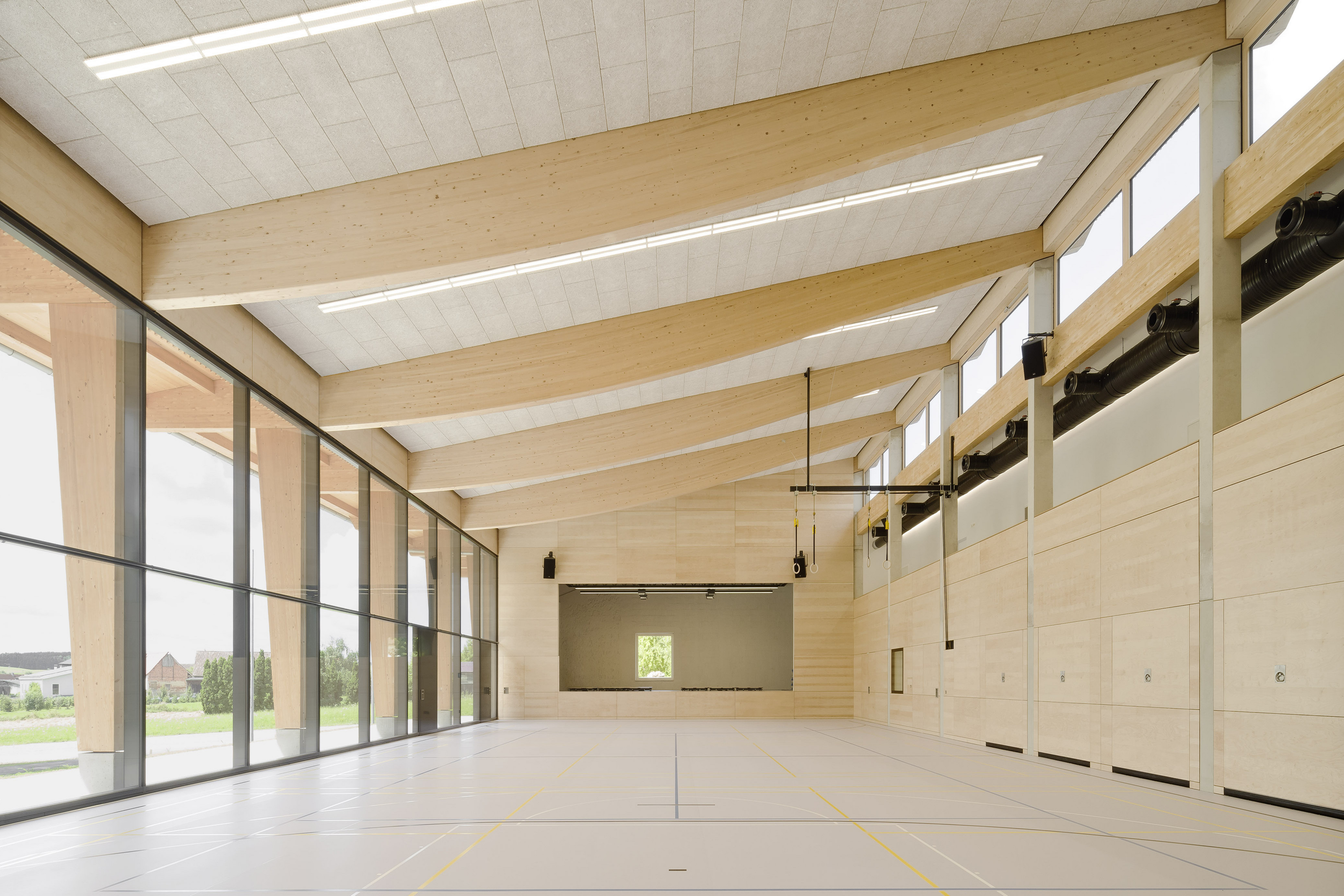 Im schwäbischen Ingerkingen haben die Architekten vom Büro Atelier Kaiser Shen die Mehrzweckhalle aus den 1960er Jahren maximal erhalten und zugleich eine völlig neue Art von Ästhetik geschaffen. Der Bestand bleibt sichtbar und wird durch ein Holztragwerk und sortenrein trennbare Materialien ergänzt. So wurde die Südfassade rückgebaut und nach außen versetzt, wodurch eine normgerechte Einfeldsporthalle und eine direkte Verbindung zum vorgelagerten Festplatz entstanden sind. Neben der ökologischen Sinnhaftigkeit des Bestanderhalts wurde der identitätsstiftende Ort unter Einbindung der Dorfgemeinschaft aufgewertet und zukunftsfähig gemacht.