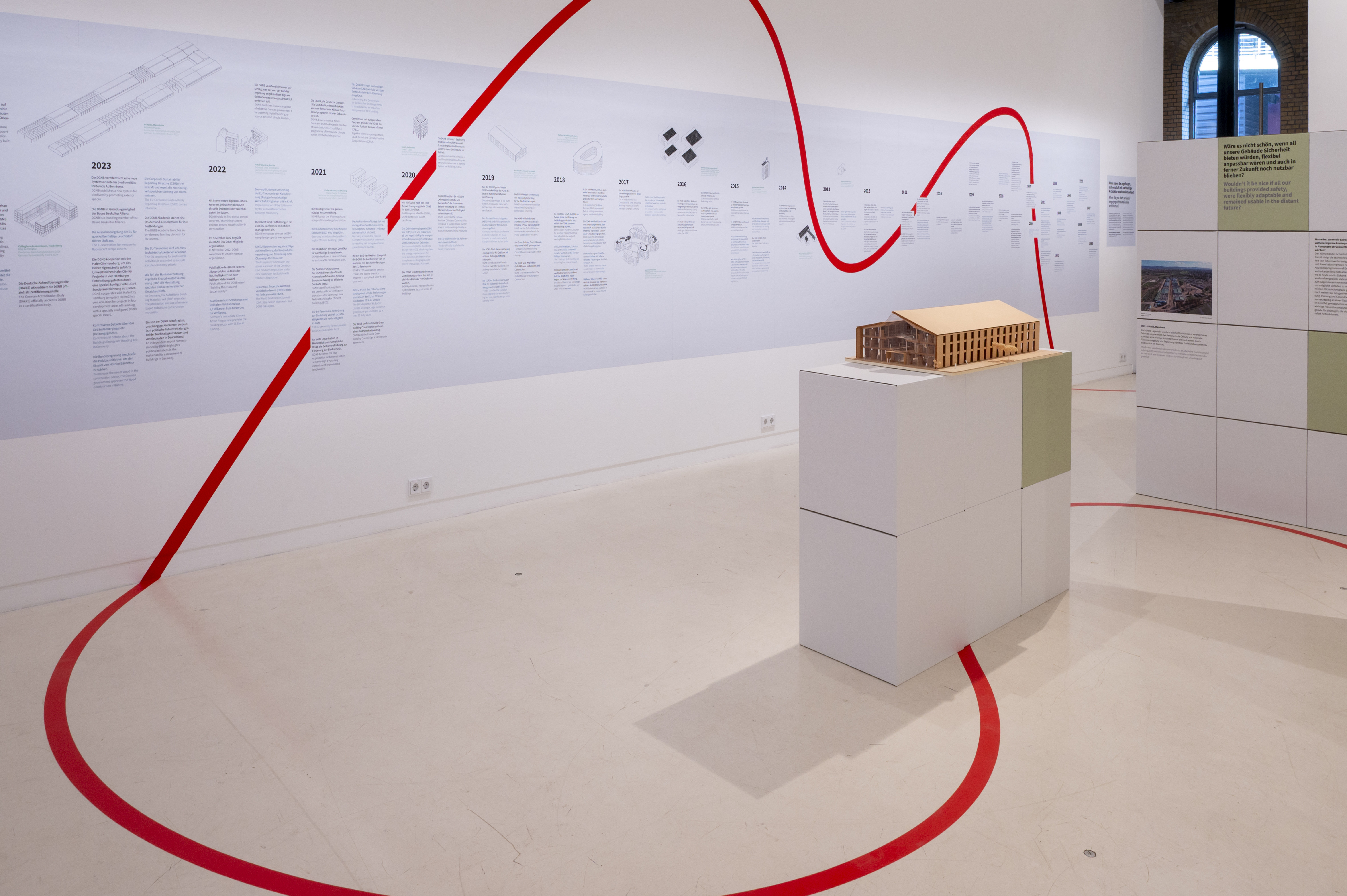 Ein rotes Band zieht sich als verbindendes Element durch die Ausstellung, die mit der Frage beginnt, wann die Besuchenden selbst angefangen haben, sich ernsthaft mit nachhaltiger Architektur auseinanderzusetzen. Es ist der Startpunkt einer Zeitreise durch wesentliche Meilensteine in der Entwicklung des nachhaltigen Bauens und der DGNB.