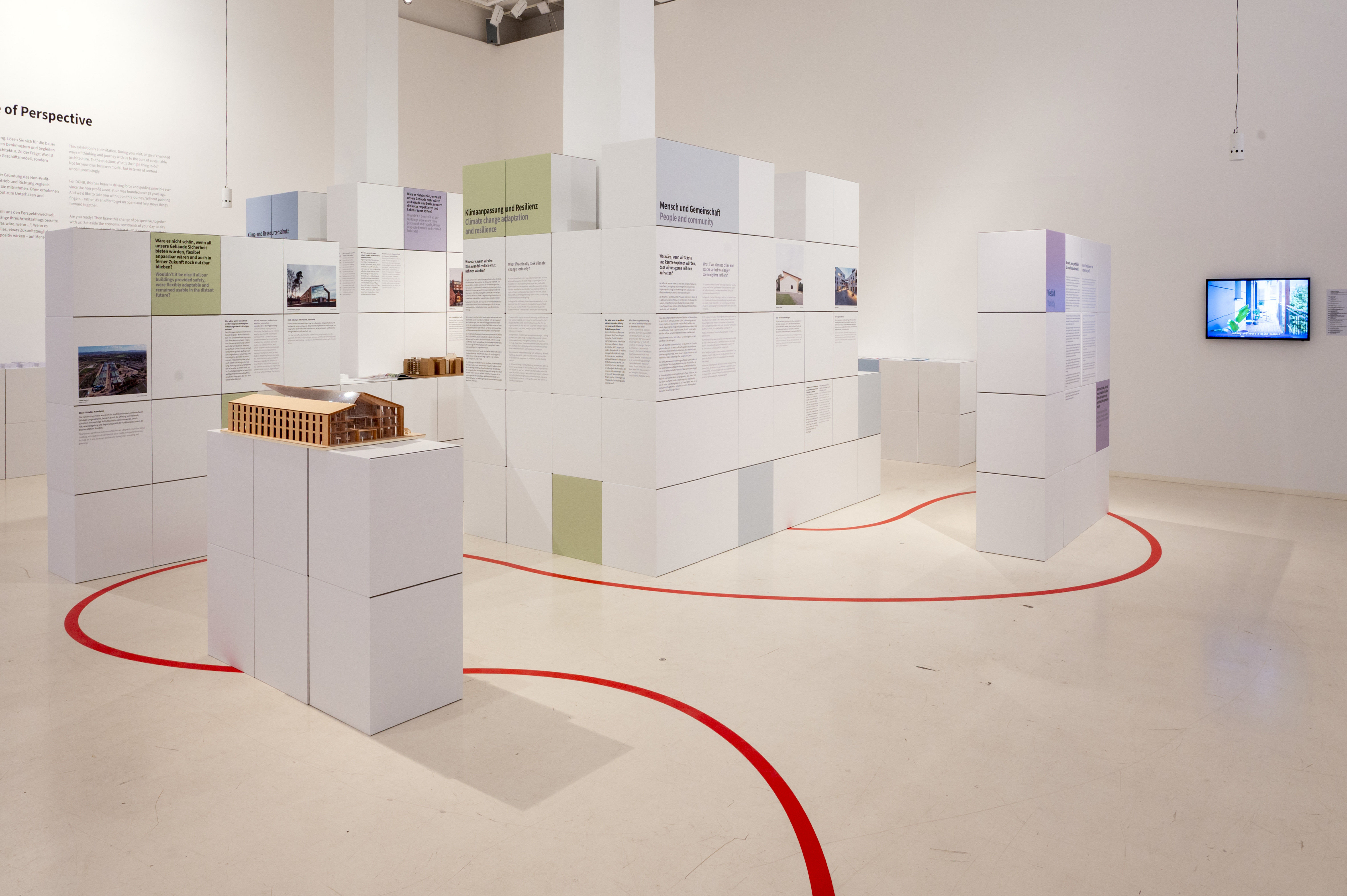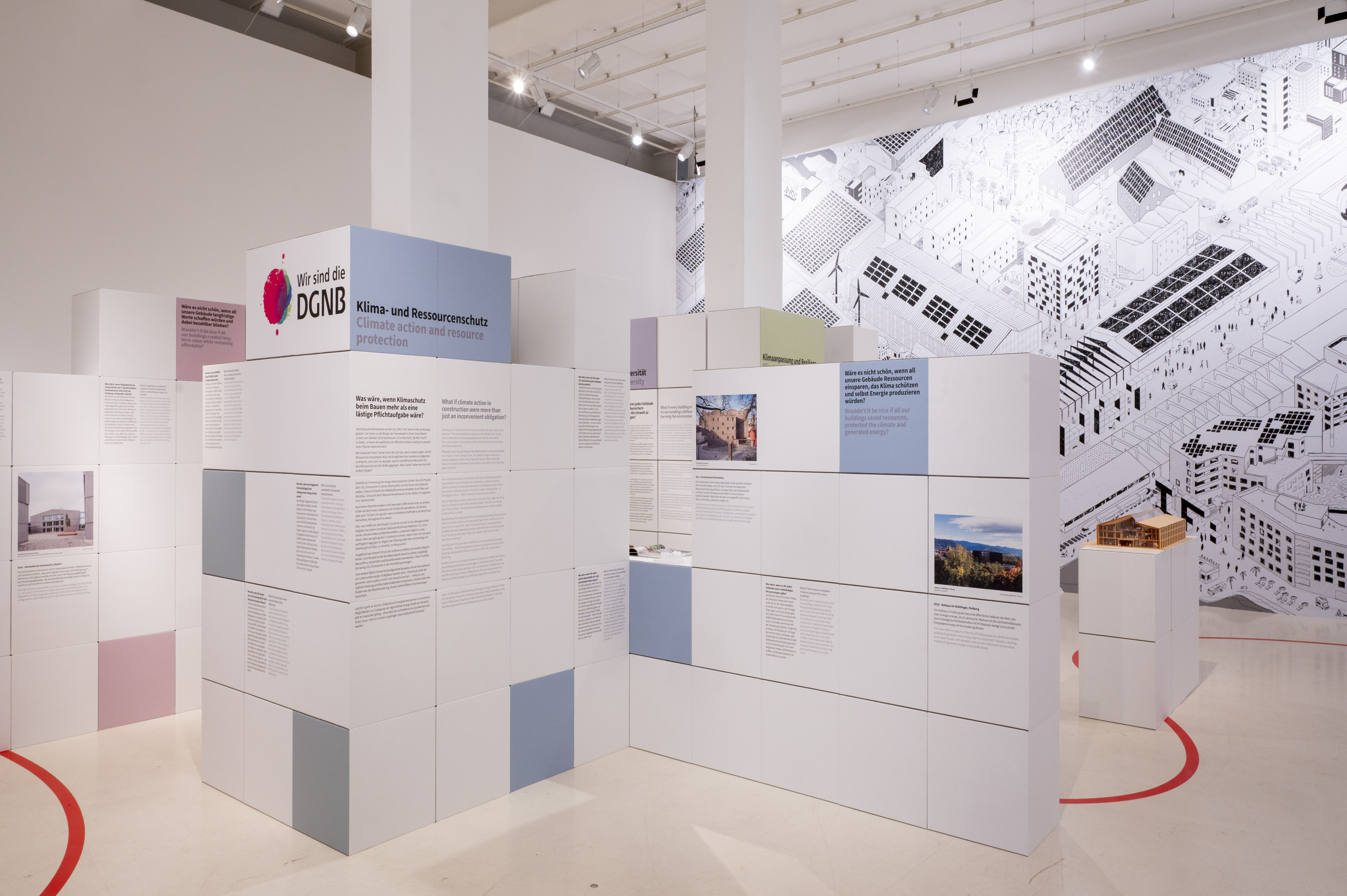 Die übrige Ausstellung ist komplett mit 50 Zentimeter breiten Kuben aus Pappe bespielt, die eine außergewöhnliche räumliche Wirkung erzeugen. Zoniert ist dieser Teil der Ausstellung entlang einiger der zentralen Themenschwerpunkte von nachhaltiger Architektur: Klimaschutz und Ressourceneffizienz, Klimaanpassung und Resilienz, Mensch und Gemeinschaft, Flächenschutz und Bestandserhalt, Biodiversität sowie Kosten vs. Risiken.