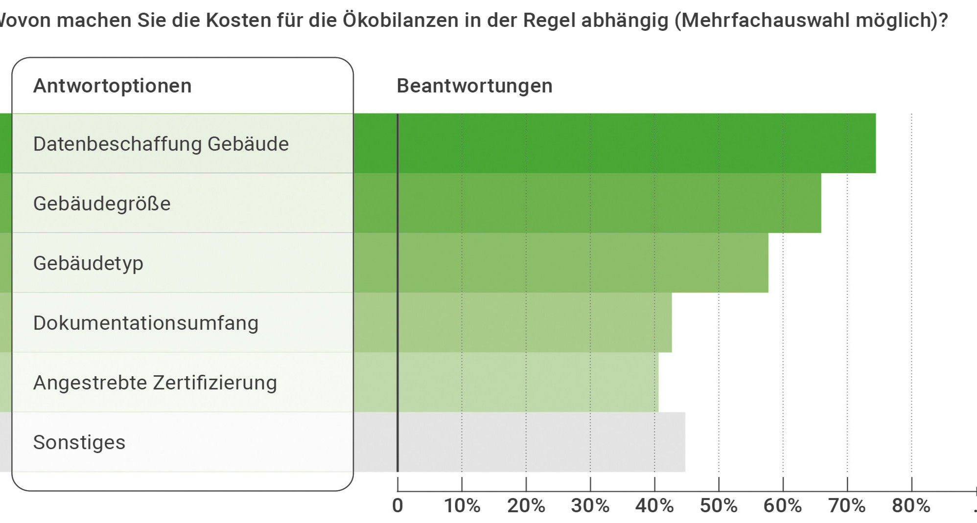Bei der Frage, von welchen Faktoren die Höhe der Kosten abhängt, geben mehr als 70 Prozent der Befragten den tatsächlichen Aufwand zur Datenbeschaffung an. Auch die Gebäudegröße und der Gebäudetyp spielen für über die Hälfte der Experten eine einflussnehmende Rolle. Möglichkeiten zur Kostenreduktion werden von den Befragten in der Anwendung von BIM (Building Information Modelling) und digitalen Zwillingen gesehen. Auch wurde auf die Notwendigkeit der Standardisierung der Datengrundlage und Vereinfachungen bei der Software sowie die Bereitstellung digitaler Bauteilkataloge hingewiesen.
