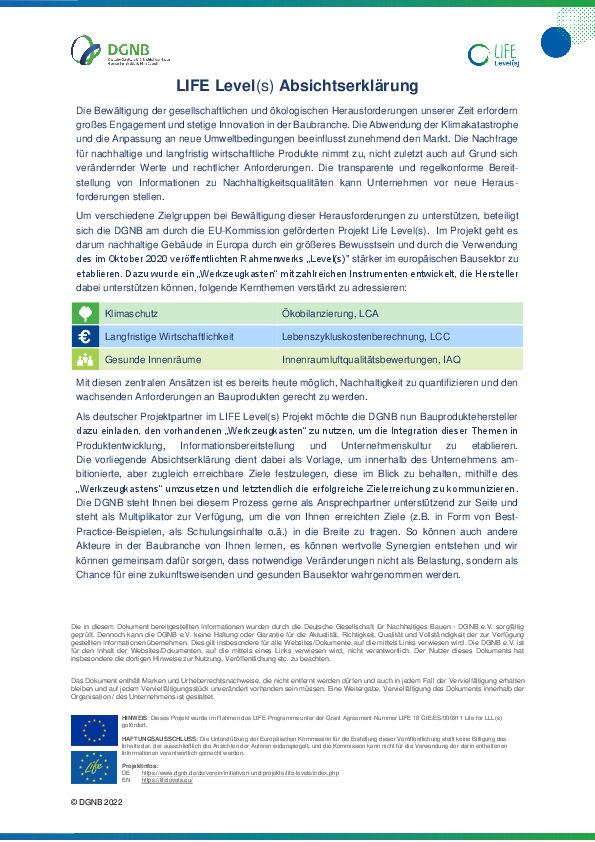 Ausführlichere Informationen zum Level(s)-Rahmenwerk sowie zum Projekt und den Partnern finden Sie auf der offiziellen Projektwebsite. Aktuelle Informationen zum Projekt erhalten Sie zudem über den LIFE Level(s) Newsletter oder den DGNB Newsletter.
