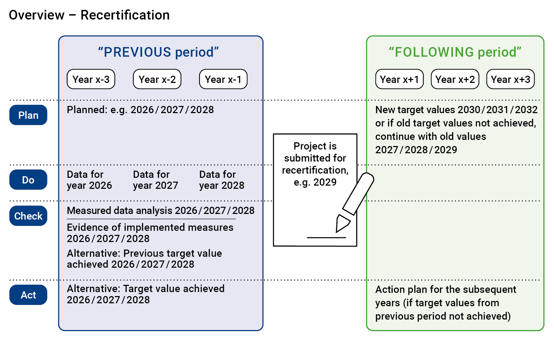 The certificate is valid for three years from the date of issue and, similar to the certification of a building, can be recertified by submitting annual consumption data. In addition, all relevant criteria are submitted every three years.
