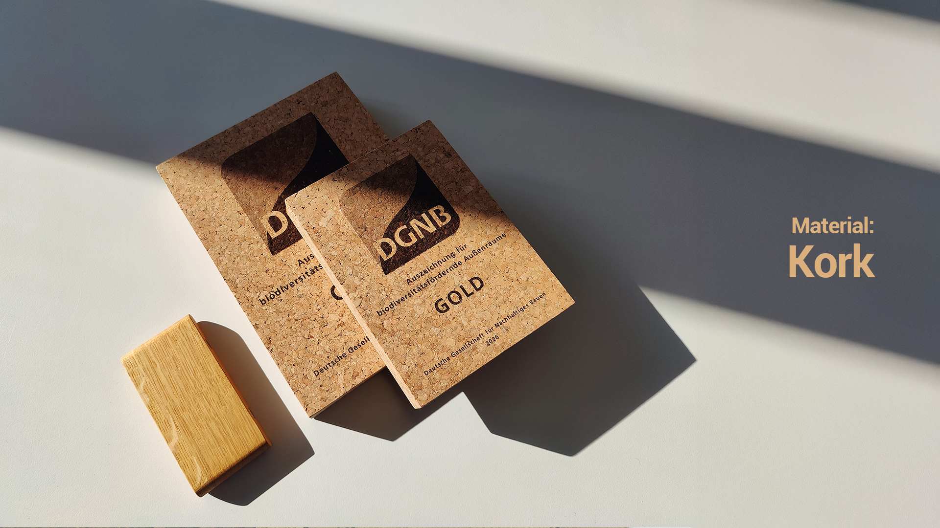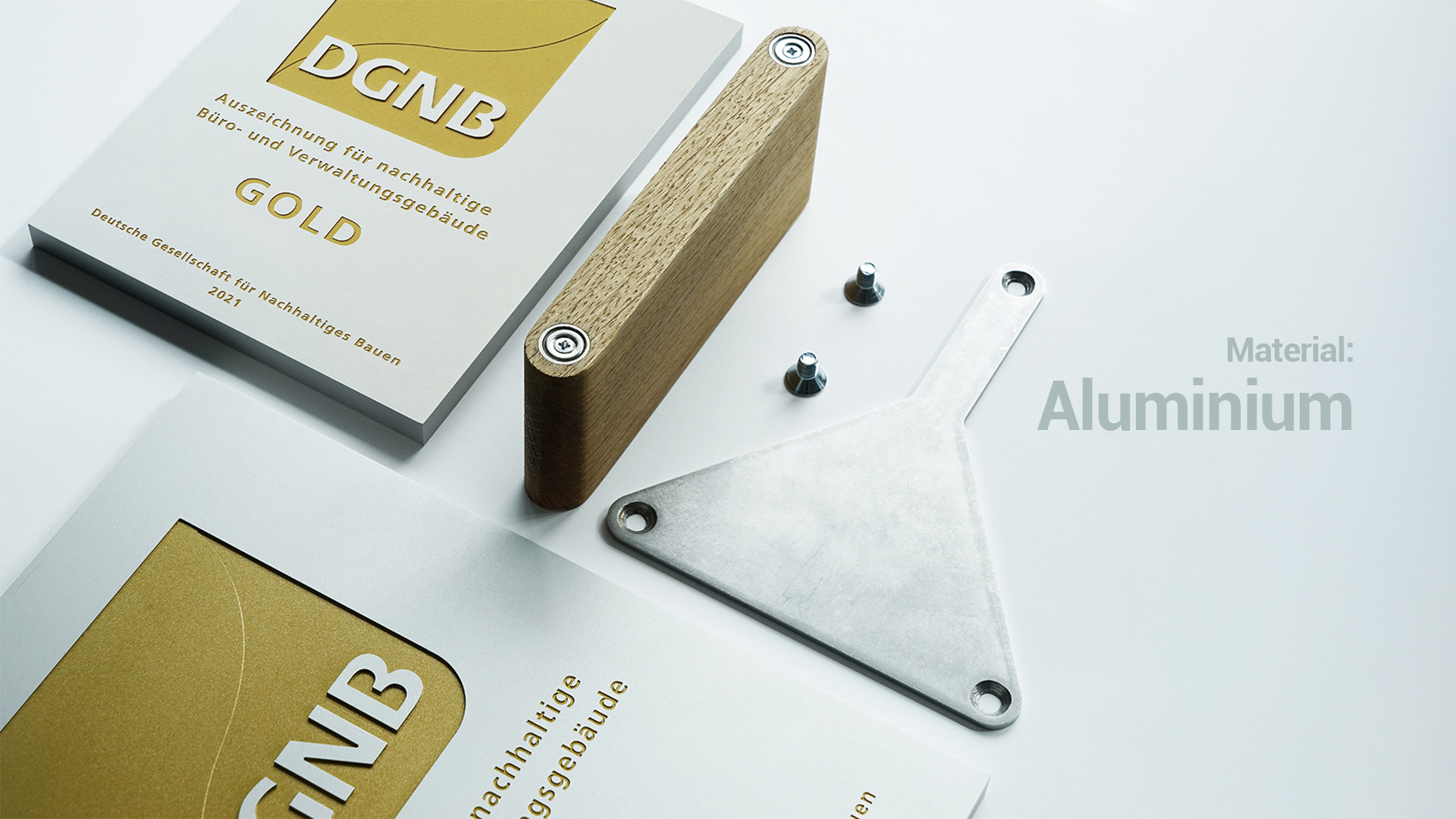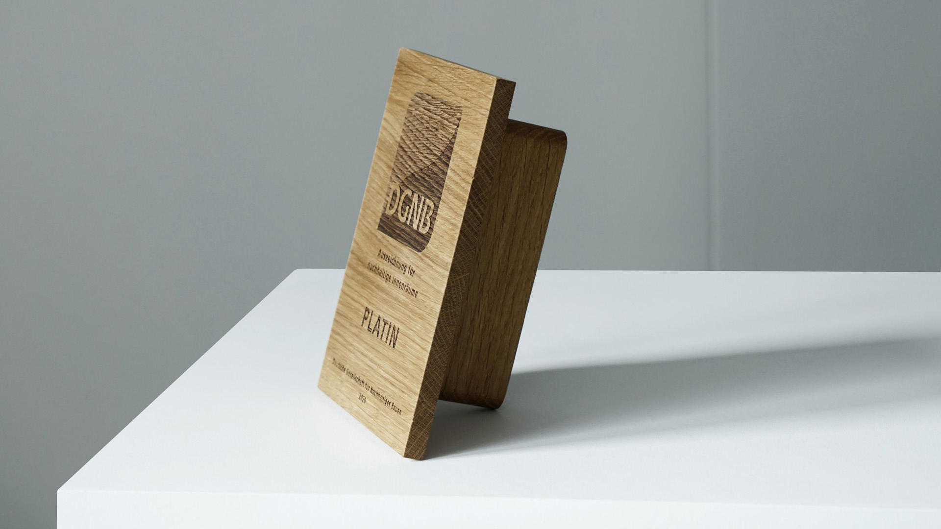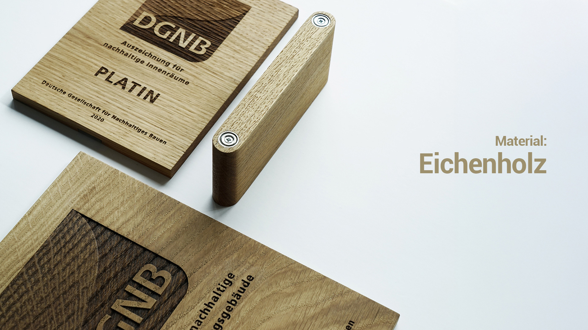 This plaque, made of solid oak, has an individual grain that is accentuated even more by the further step of oiling the surface. Each plaque is handcrafted by a carpenter's workshop in the heart of Stuttgart, in the immediate vicinity of the DGNB office.