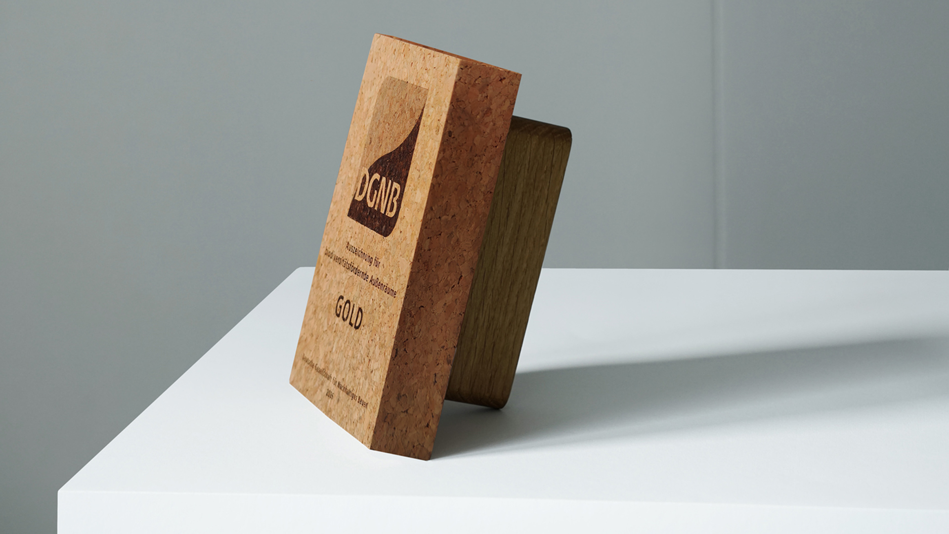 With the DGNB sign, you show the certification in the building with great long-distance effect. The sign is made of recycled cardboard with fire protection classification B1.