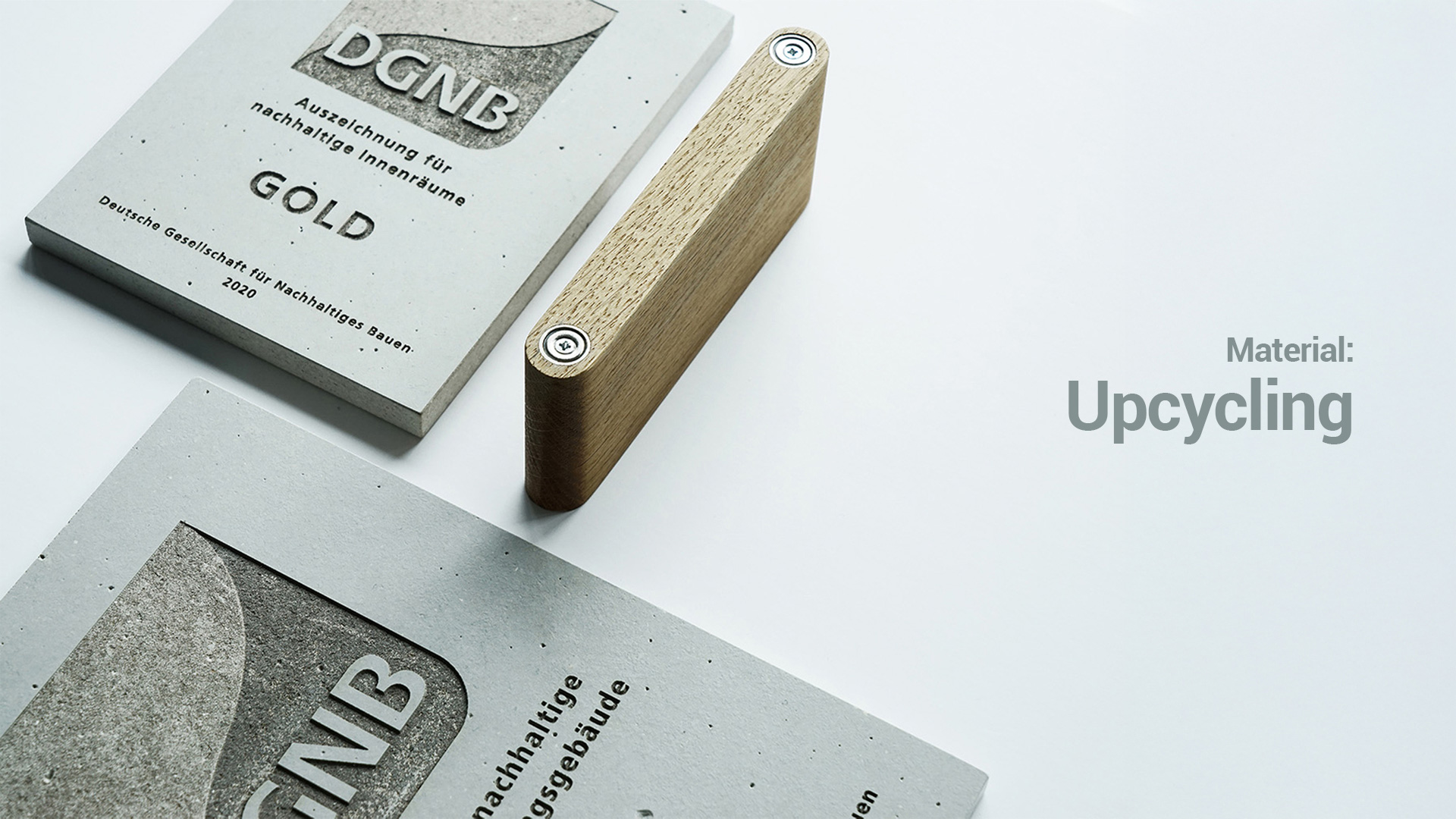 We offer four different plaque materials to display your certification on and in the building: aluminium (outdoor), oak wood (indoor), upcycling (indoor) and cork (indoor/outdoor).