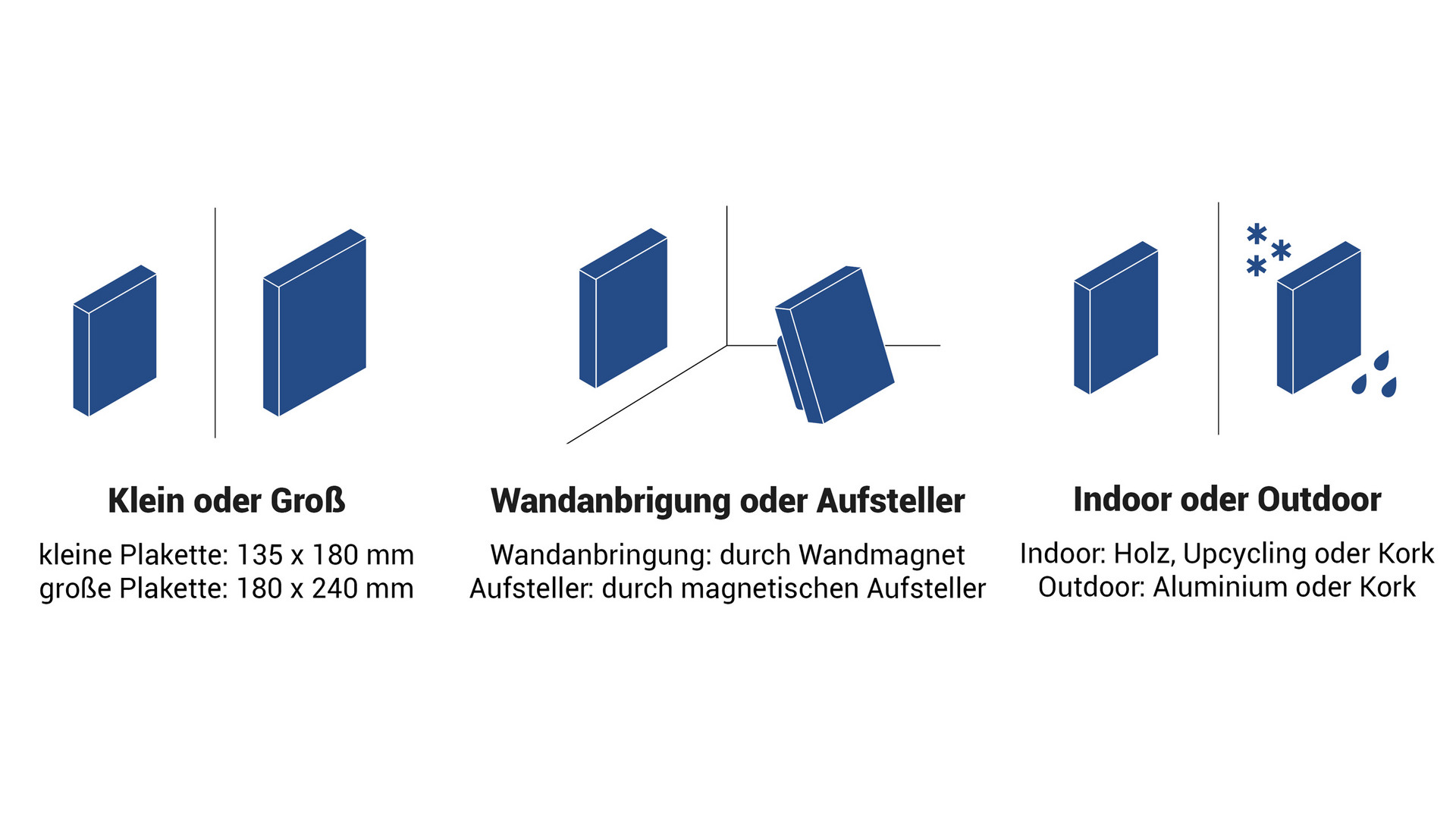 All plaques are available in two sizes. Thanks to their modular design, all plaques are compatible with a variety of mounting accessories. This means you can find a plaque that is ideally suited to your building situation.